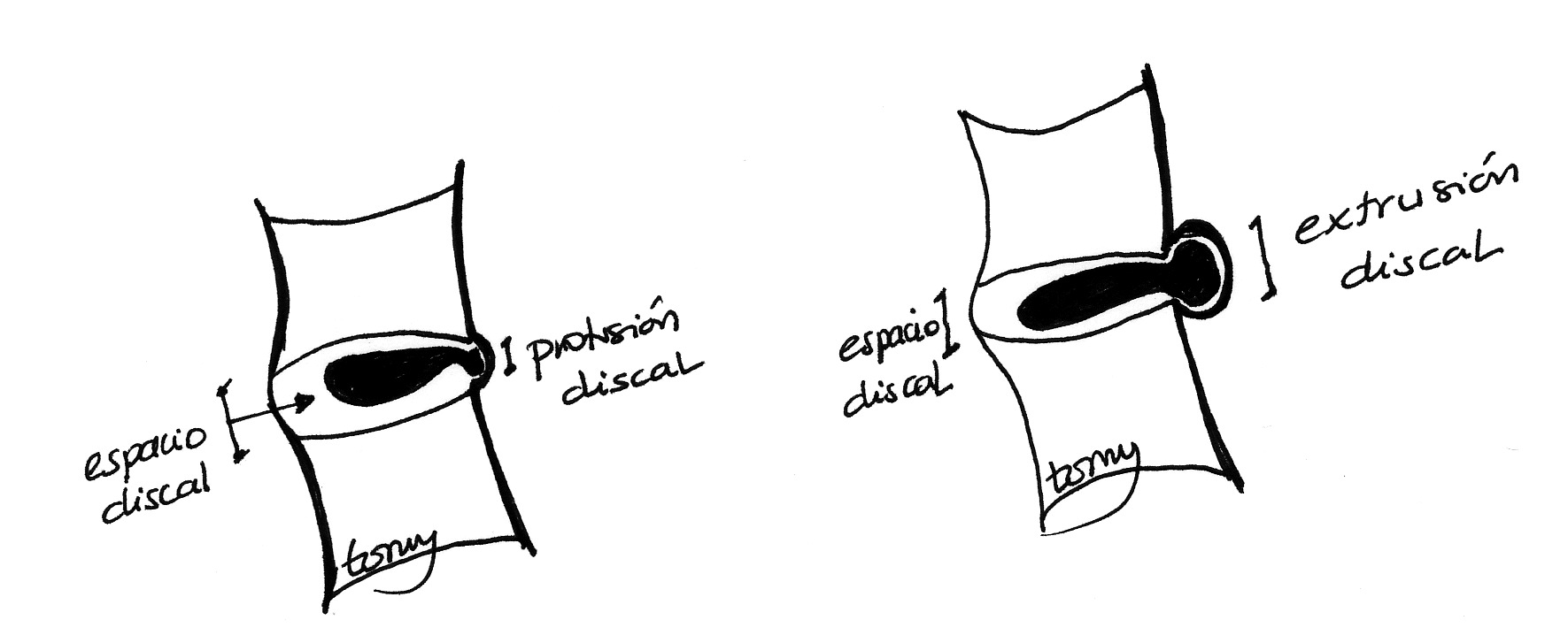 El disco herniado o herniación puede tomar las formas de protusión o extrusión, que se diferencian por la morfología del material desplazado. Se denomina protusión cuando la mayor distancia en cualquier plano, entre los bordes del material discal desplazados más allá del espacio discal es menor que la distancia entre los bordes de la base, en el mismo plano. La base se define como el área transversal de material discal en el margen más distal del espacio discal de origen, donde el material desplazado es contínuo con el material discal del espacio intervertebral. Se denomina extrusión si en al menos un plano, cuando la distancia entre los bordes del material discal desplazado es mayor que el espacio discal del que se origina o bien cuando no hay continuidad entre el material discal desplazado y el que permanece en el espacio discal.