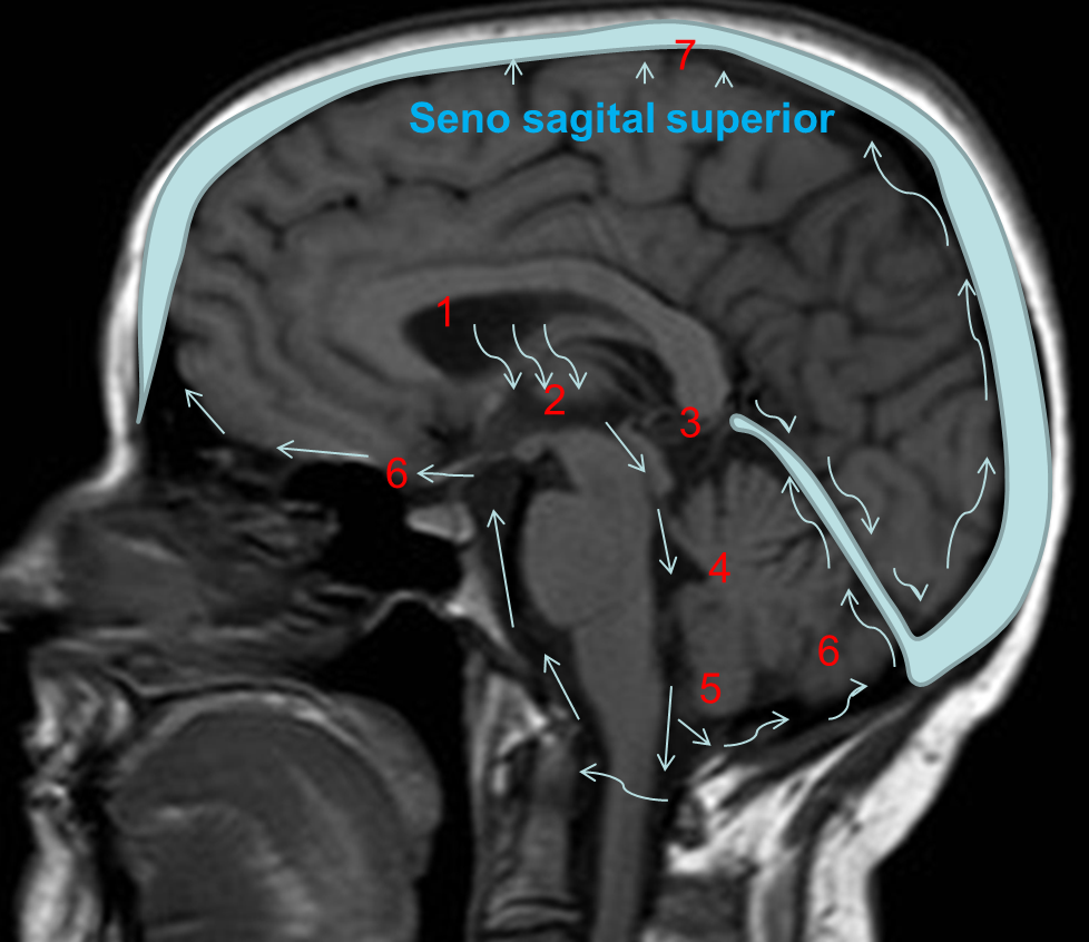 En la Imagen 2. podemos ver la circulación habitual del LCR. El líquido cefalorraquídeo (LCR) se produce de forma continua en los plexos coroideos que están situados fundamentalmente en los ventrículos laterales 1 (también en el III y IV ventrículo), posteriormente pasa al III ventrículo 2, después por el Acueducto de Silvio 3 pasa al IV ventrículo 4, y de ahí al espacio subaracnoideo 5 y 6 donde se dirige hacia la convexidad cerebral para reabsorberse en las granulaciones aracnoideas y pasar al sistema venoso por medio del seno venoso sagital superior 7.