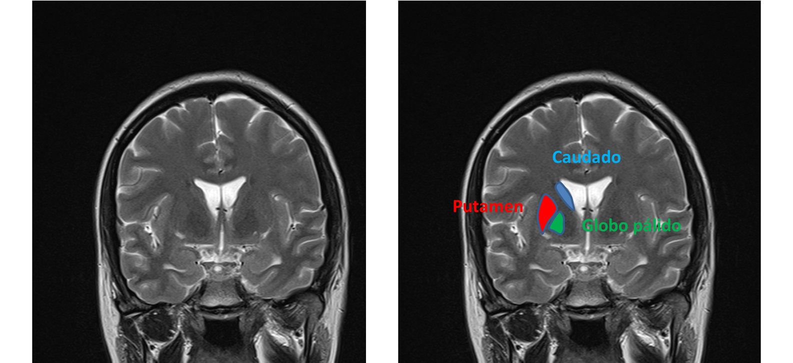 1. Calcificaciones bilaterales localizadas en el estriado (caudado-putamen), globo pálido y núcleo dentado (ver la figura 1. para localización de estas estructuras) visualizado en imágenes de TAC cerebral.