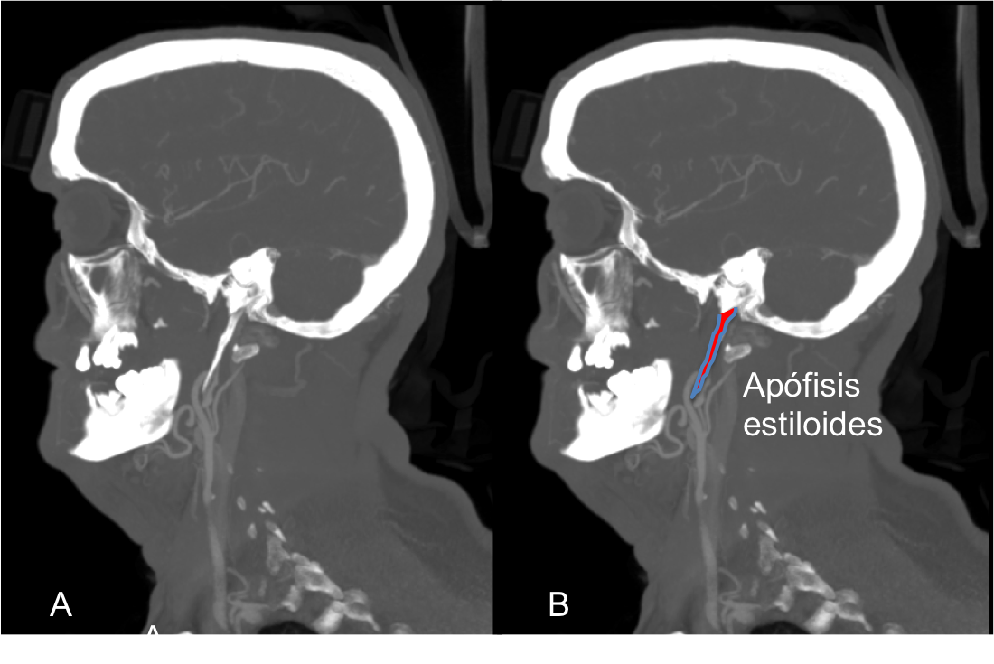 En la Figura 2. se puede observar la apófisis estiloides elongada en relación con el inicio de la disección de la arteria carótida interna izquierda.