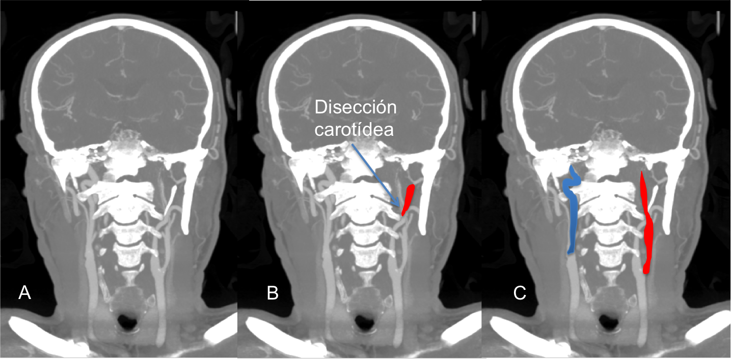 Os presento un paciente que debutó con una hemiplejía derecha y un afasia donde se observó a su llegada a urgencias en la TAC cerebral una lesión isquémica aguda en el territorio de la arteria cerebral media izquierda. En la AngioTAC de TSA se observa un cierre de la arteria carótida interna izquierda sugestivo de disección carotídea (figura 1. B flecha; en rojo porción distal de la apófisis estiloides). Posteriormente, se confirmó la presencia de hematoma intramural por resonancia cervical con secuencias T1 y T2.