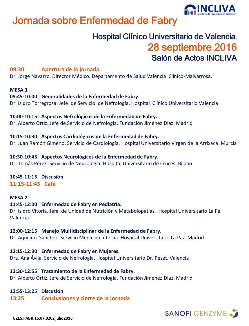 El próximo 28 de Septiembre se celebra en el Hospital Clínico Universitario de Valencia una Jornada sobre la Enfermedad de Fabry. En esta ocasión me han invitado a repasar brevemente (15 minutos) los aspectos neurológicos de la Enfermedad de Fabry.