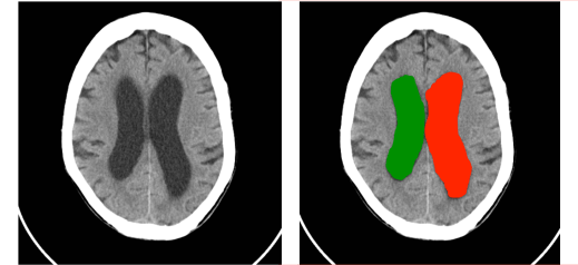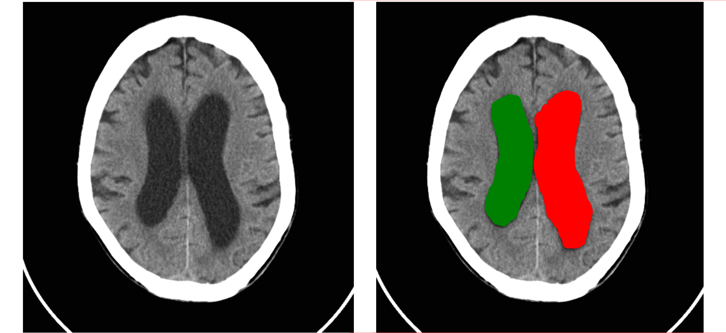 Asimetría de ventrículos laterales. Ventrículo lateral izquierdo en rojo mayor que el derecho en verde.